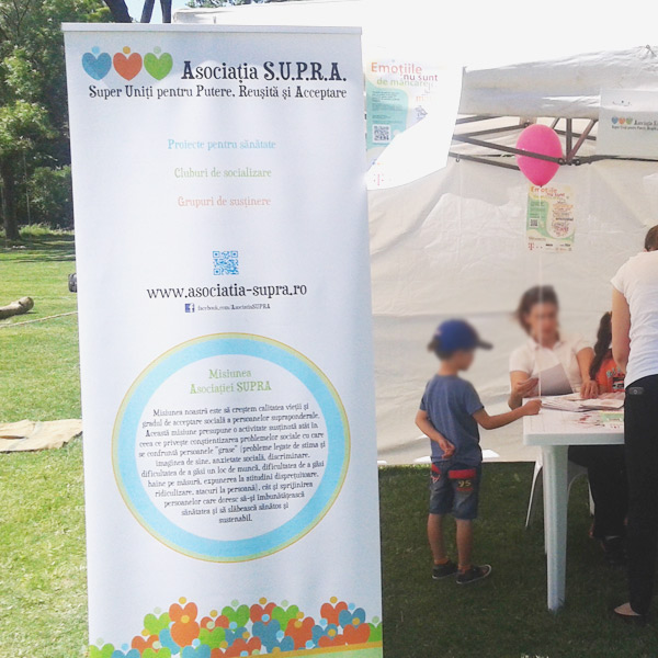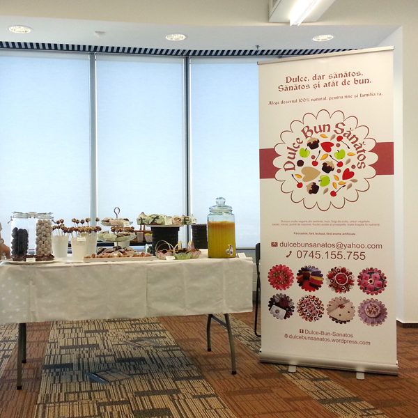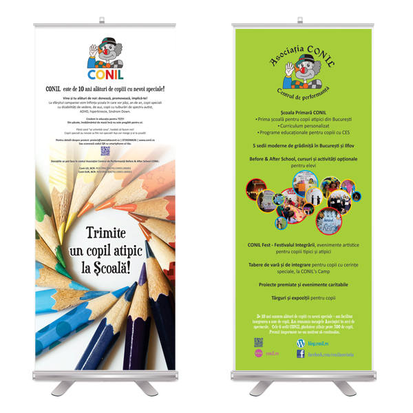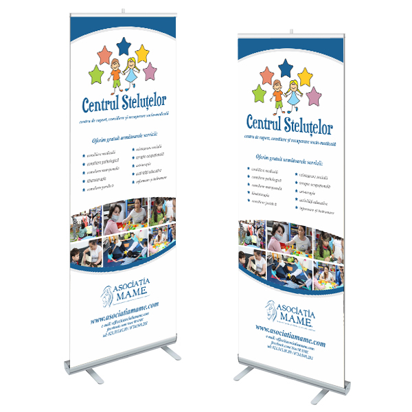 »Rollup 80x200cm, în format pregătit de tipar, cu toate informațiile necesare (generale, despre afacerea ta, sau particularizate pentru eveniment).