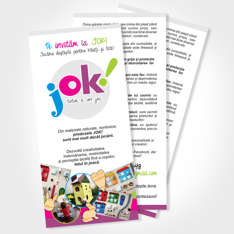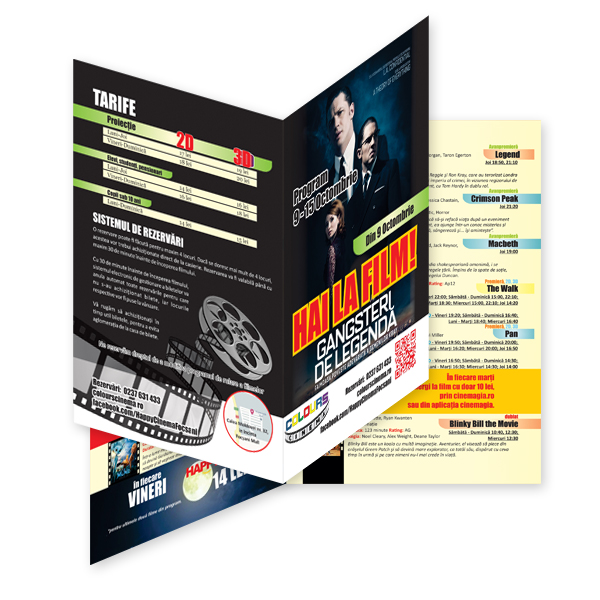 »La alegere, Flyer (1/3 din A4) sau Pliant triptic (A4 îndoit în 3) sau Flyer A5, cu informațiile pe care vrei să le promovezi. Primești fișierele în format TIF, acceptat de orice tipografie și print-shop, la rezoluție perfectă pentru tipar.
